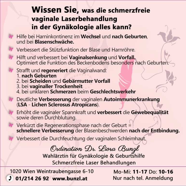 Neben den „klassischen“ gynäkologischen Leistungen biete ich Laserbehandlungen mit dem FotonaSmooth™ Lasersystem. Durch neueste Lasertechnologie werden beste klinische Ergebnisse bei Harninkontinenz, vaginaler Trockenheit, vaginalem Juckreiz, sowie hormonell und altersbedingter Rückbildung der äußeren und inneren weiblichen Organe erzielt. Auch bei Autoimmunerkrankungen der äußeren und inneren Genital- und Schleimhaut wie Lichen Sclerosus Atrophicans (LSA) und zur schnelleren Rückbildung der Geburtswege nach einer Entbindung bietet der Laser eine sanfte und effektive Behandlungsmethode.